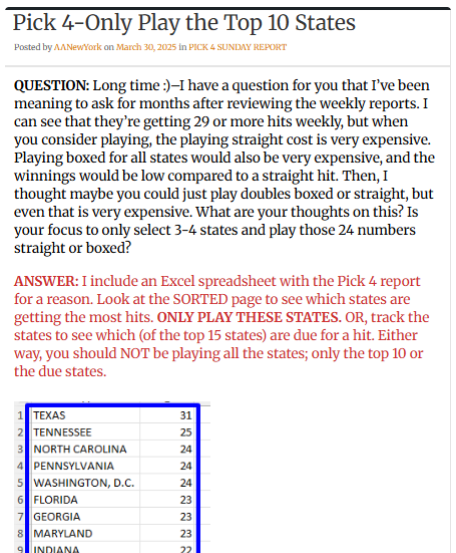 PICK 4 SUNDAY REPORT-JUNE to DEC 2025